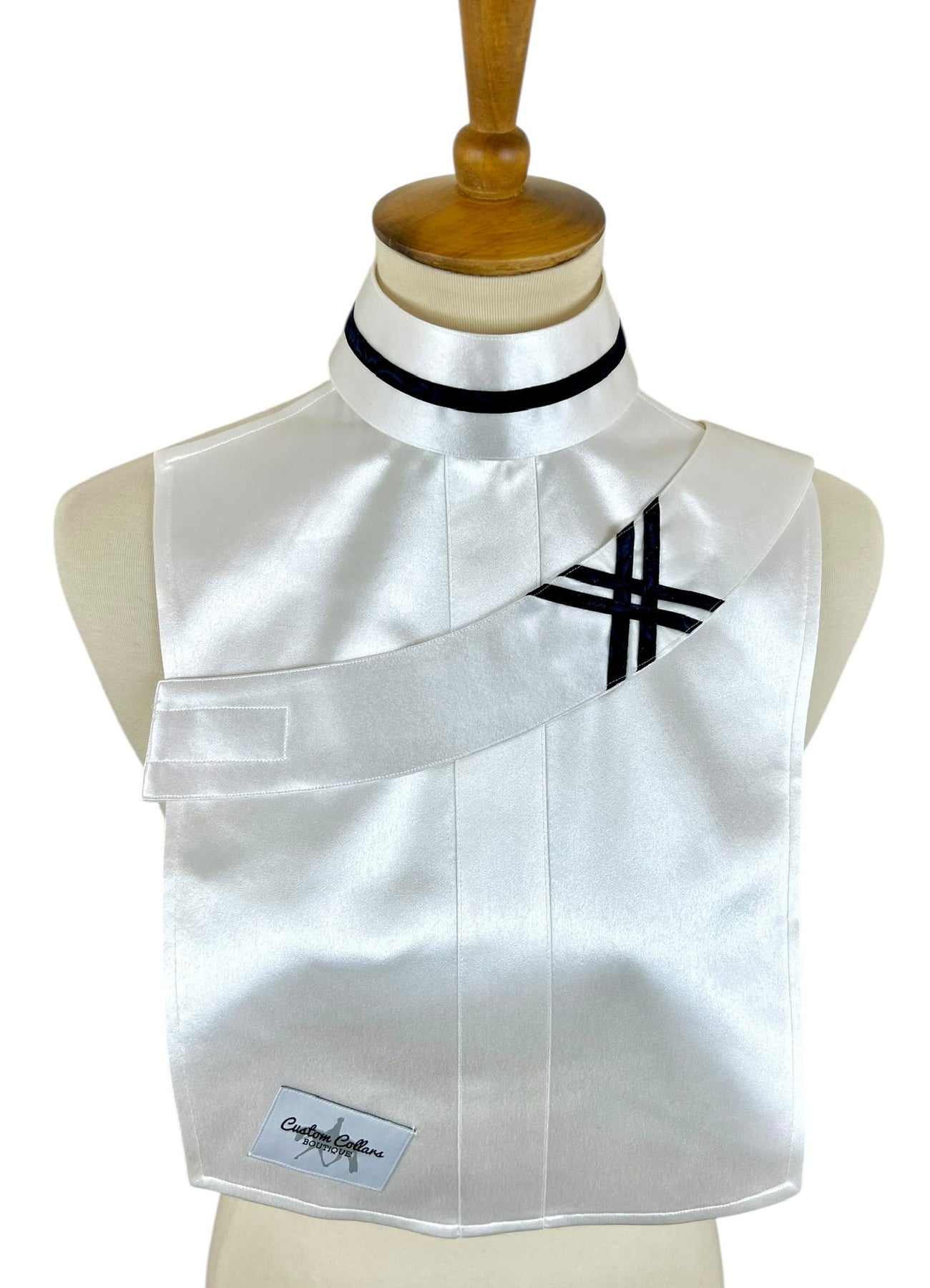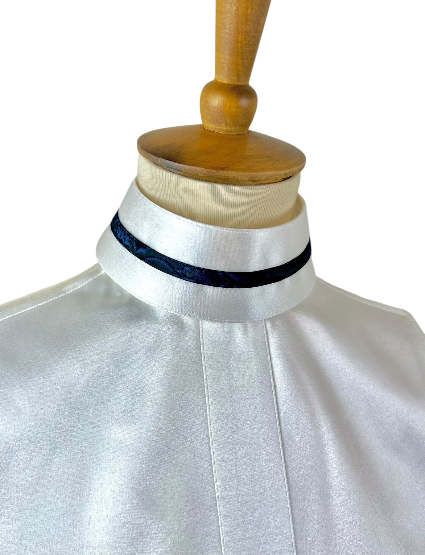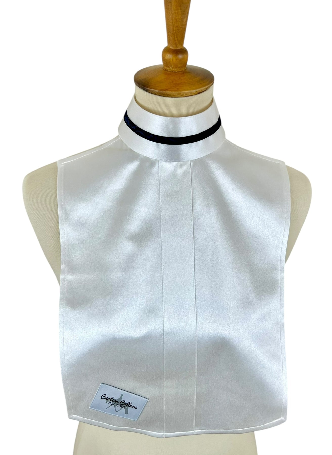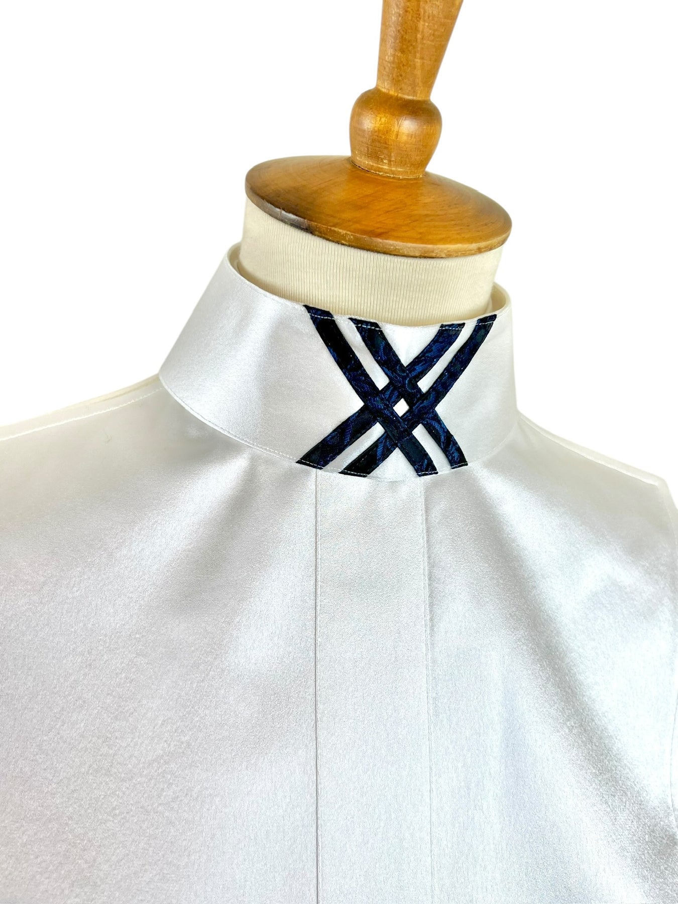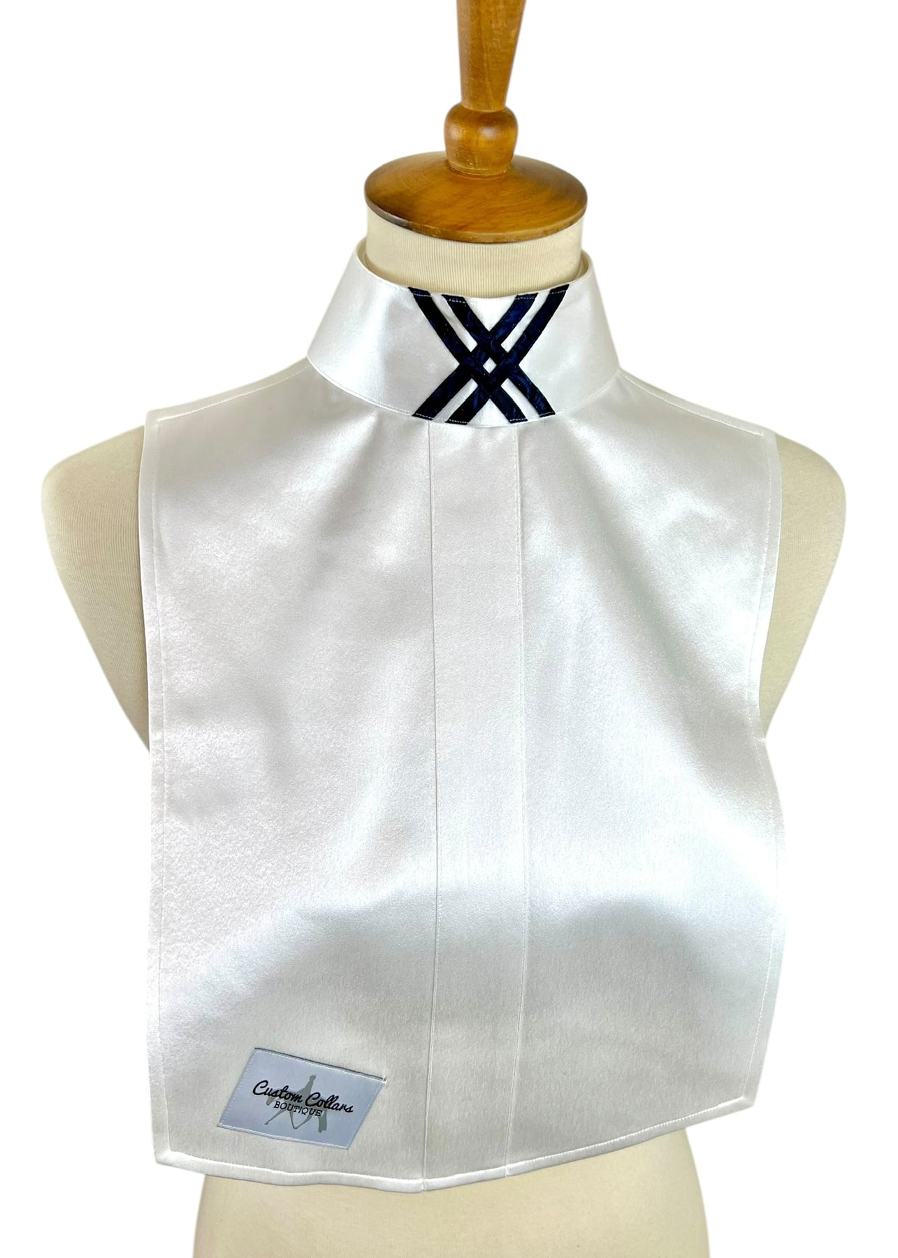 This gorgeous silk dickie features a white silk base and pairs with two silk collars with navy and blue accents.
