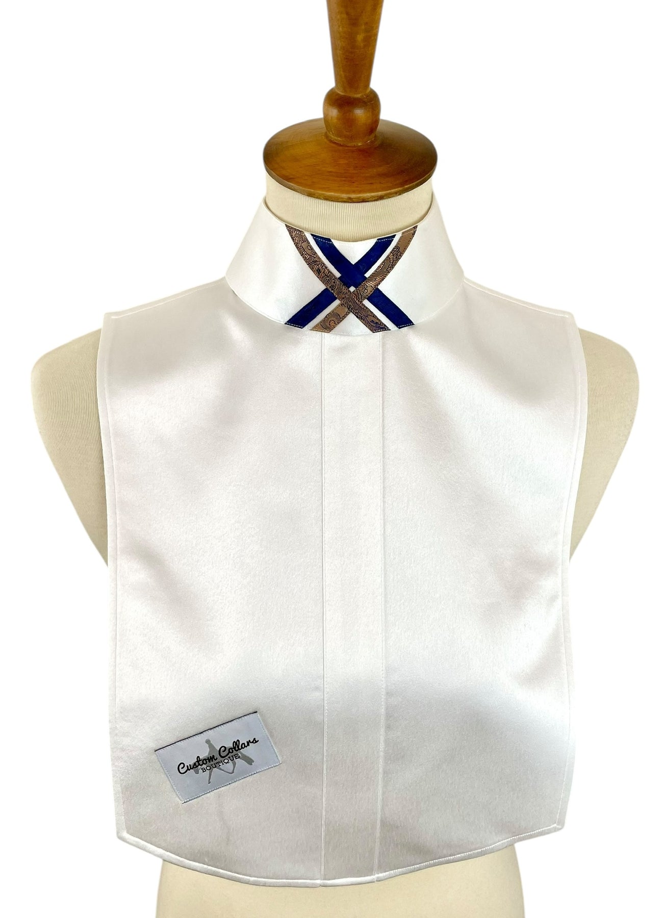 This gorgeous silk dickie features an off-white silk base and pairs with two silk collars with navy & brown paisley accents.