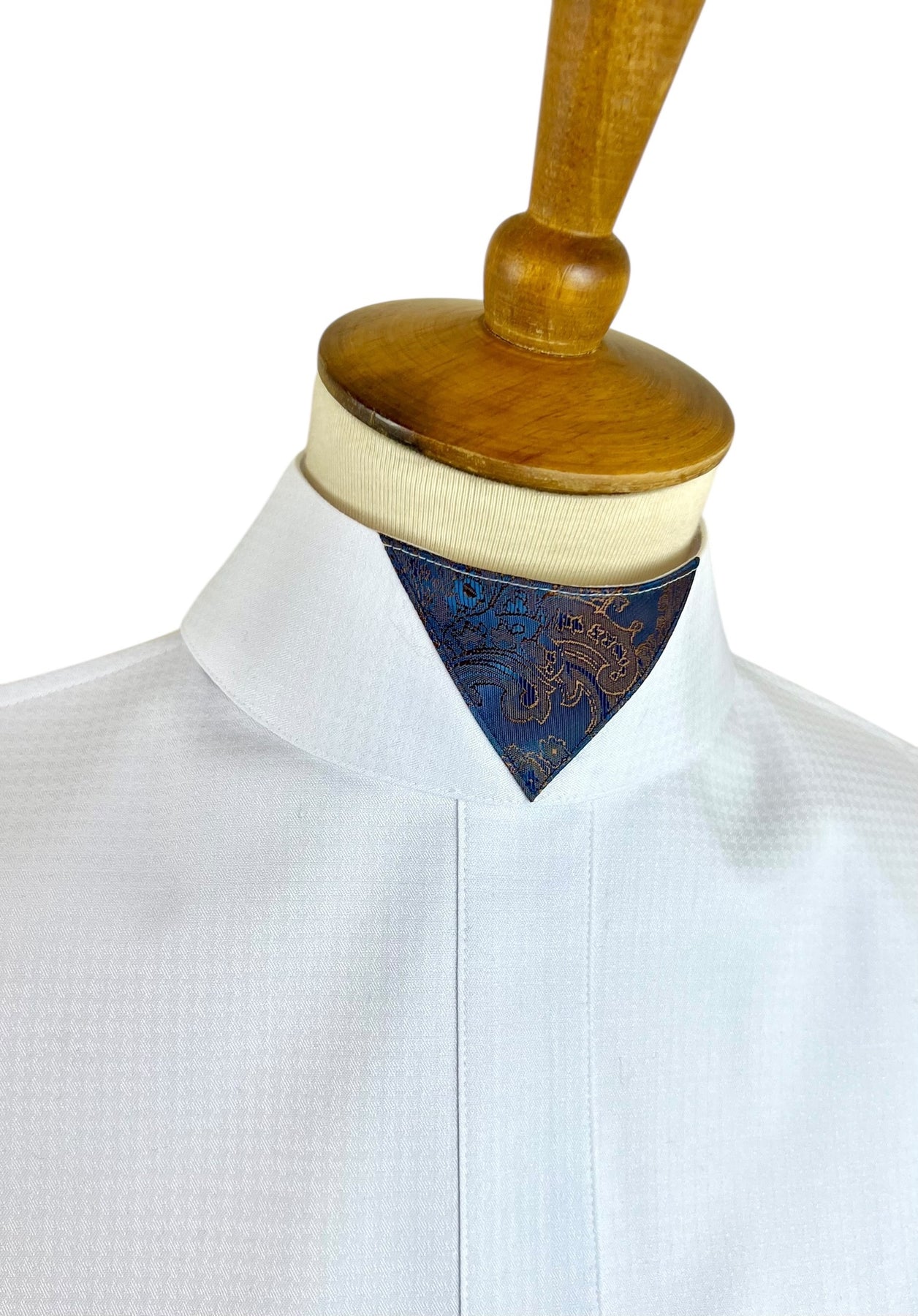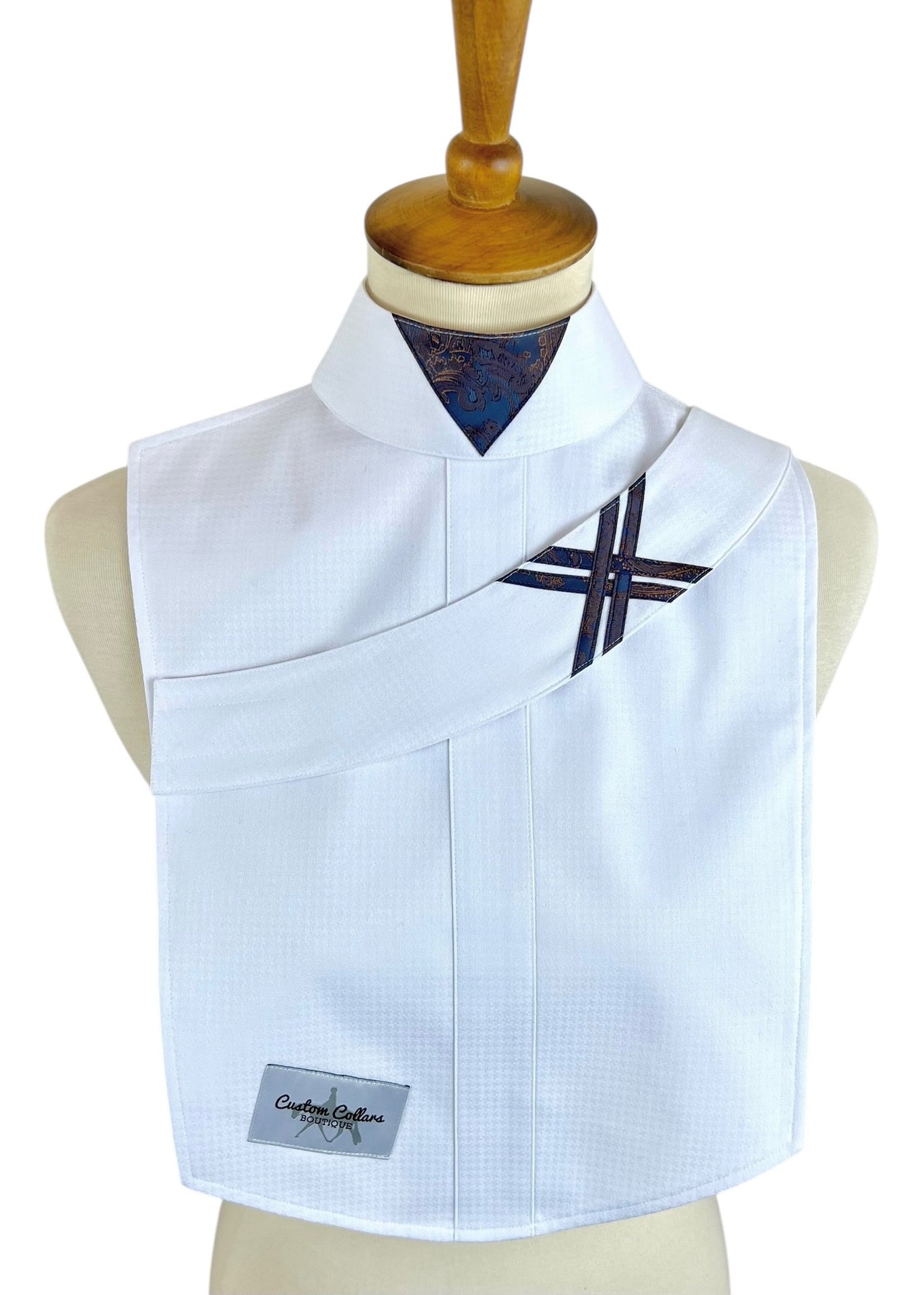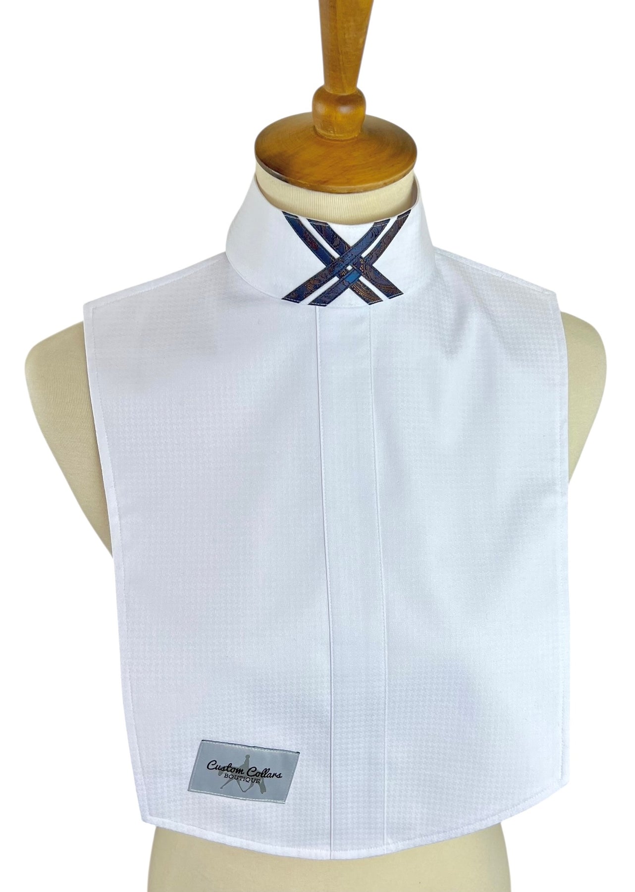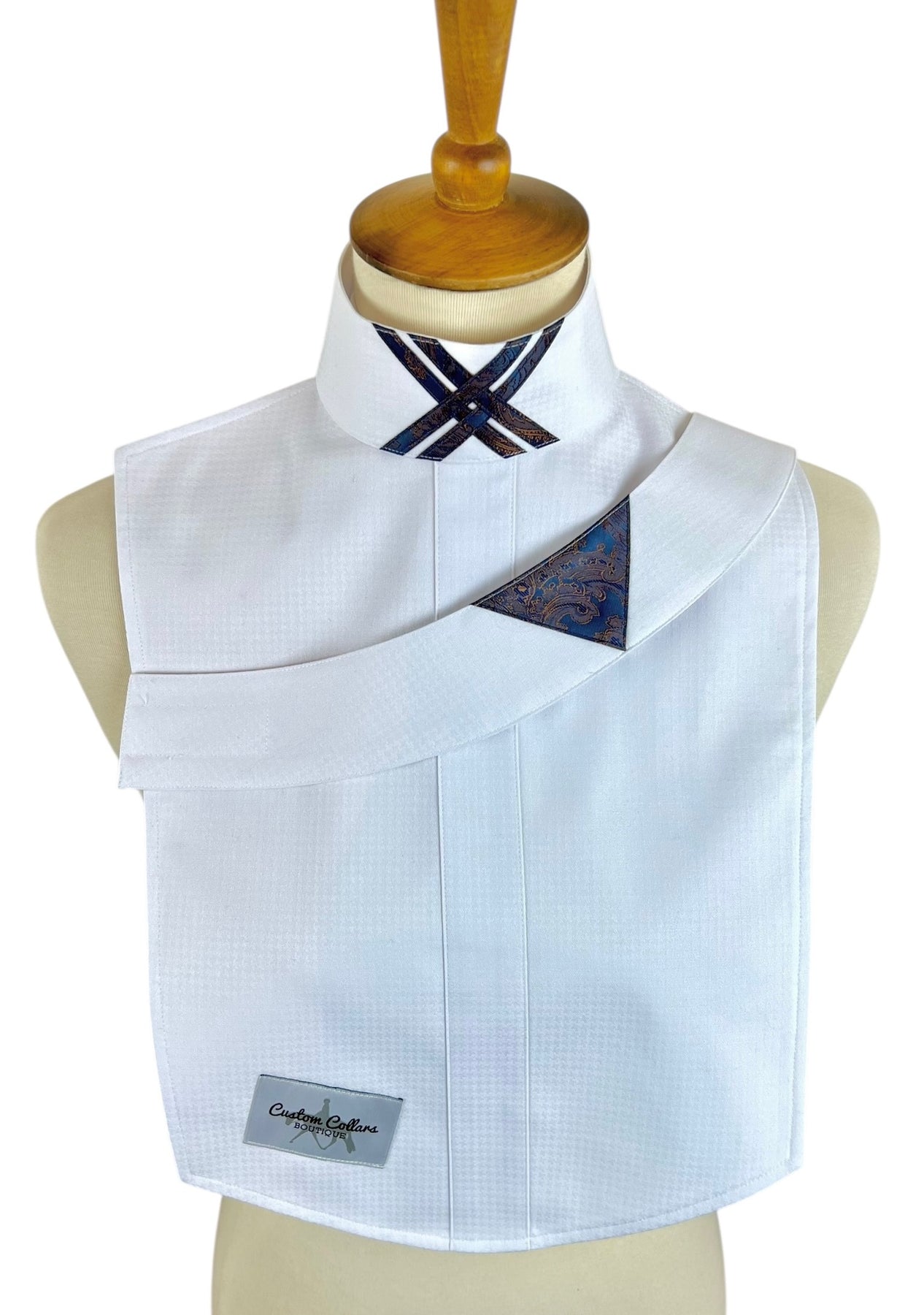 This beautiful dickie features a white satin base and pairs with two silk collars with blue/brown paisley accents.