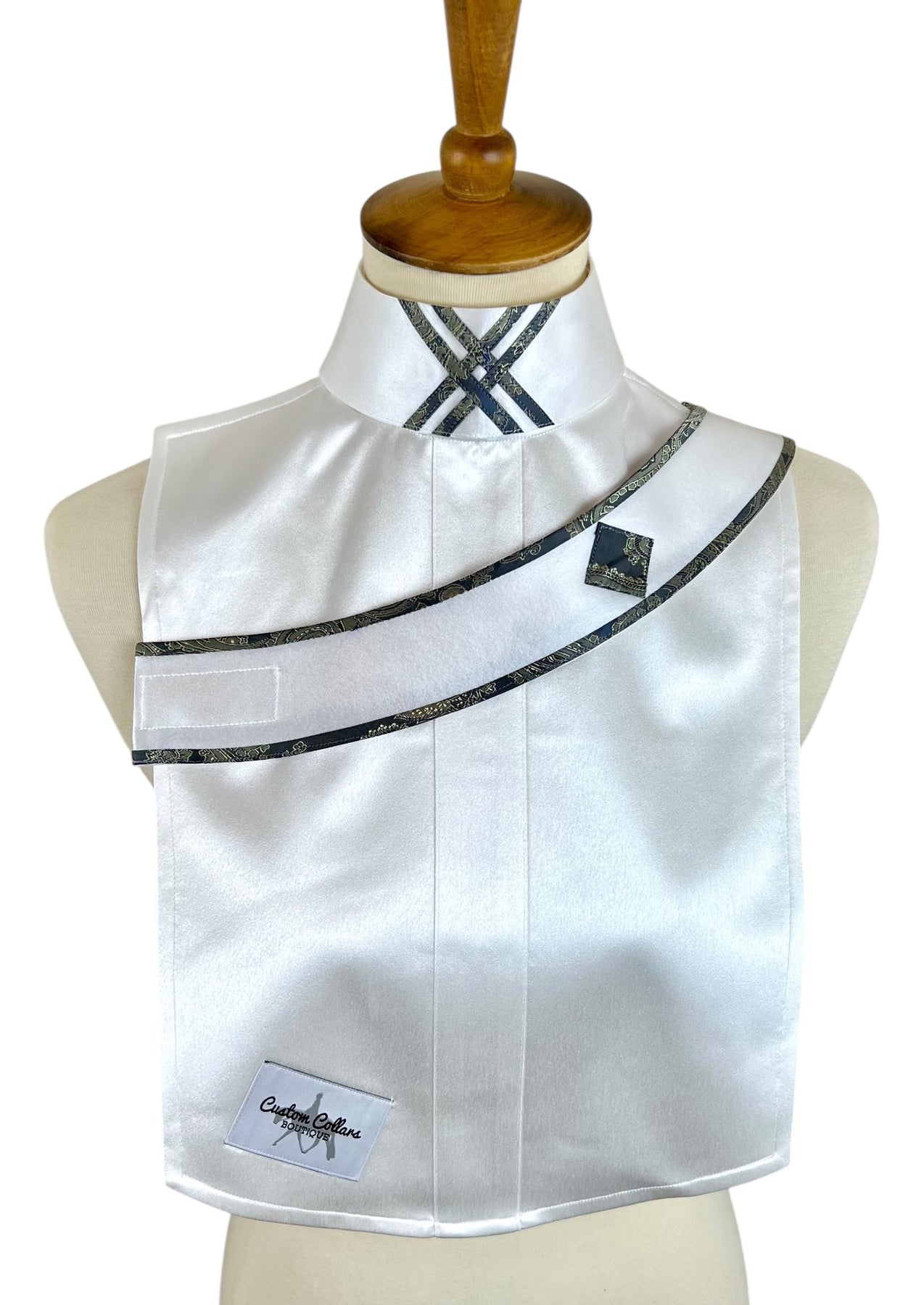 This beautiful dickie features a white satin base and pairs with two silk collars with blue & gold paisley accents.