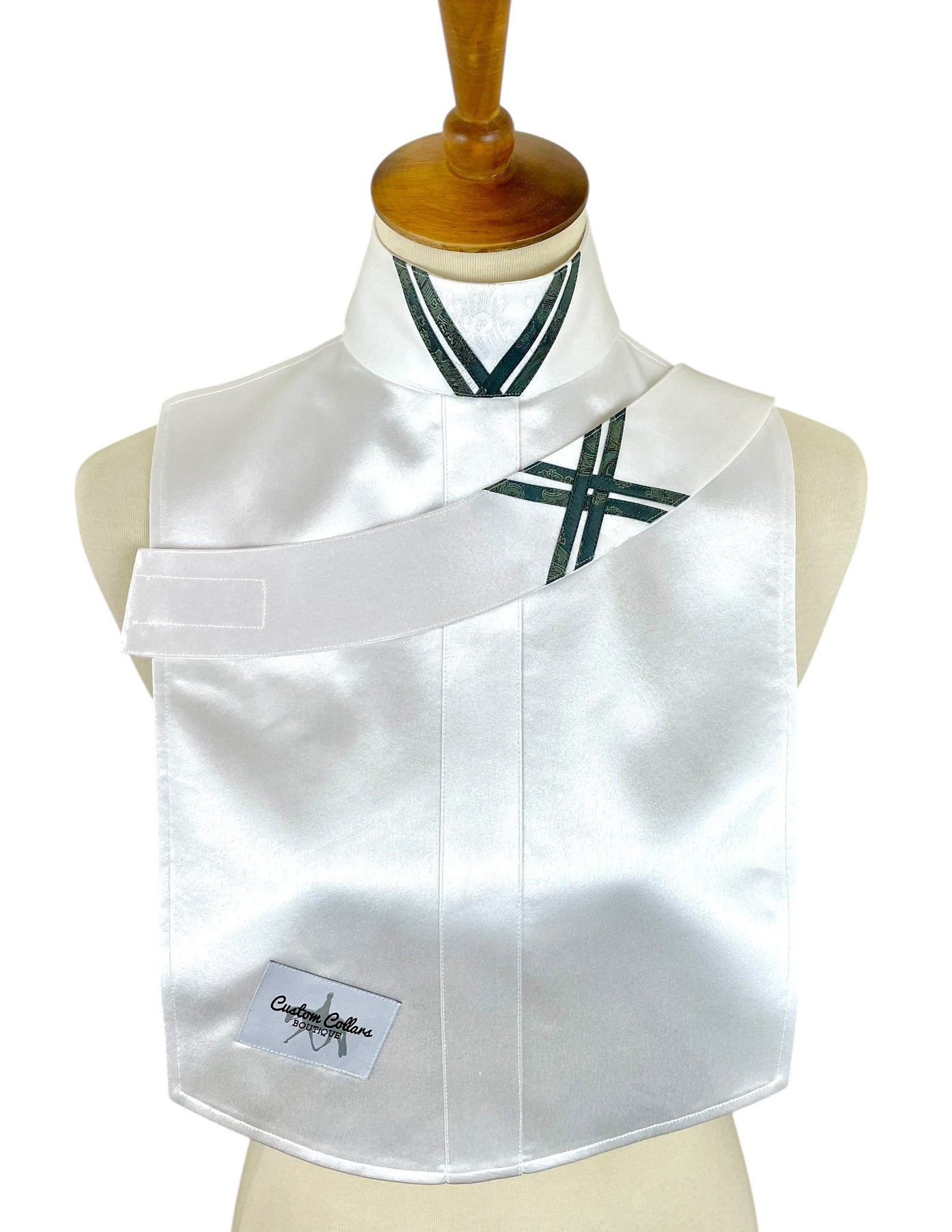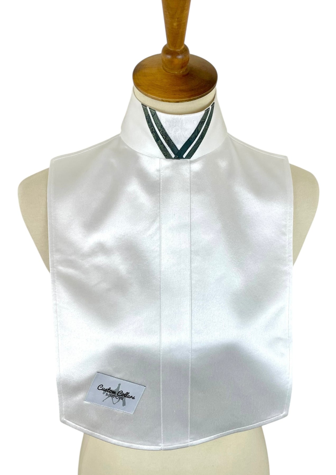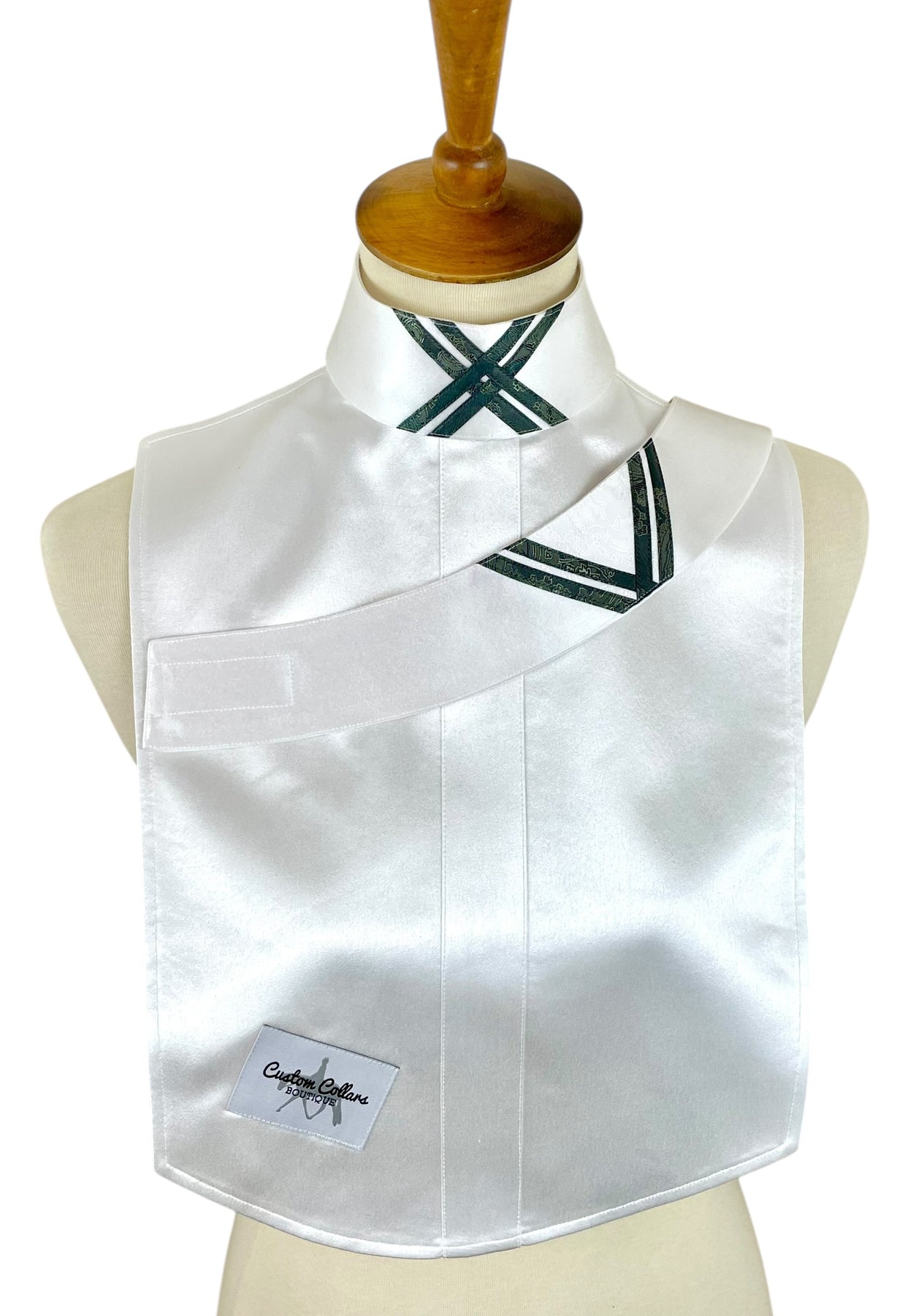 This gorgeous silk dickie features a white silk base and pairs with two silk collars with green & white paisley accents.