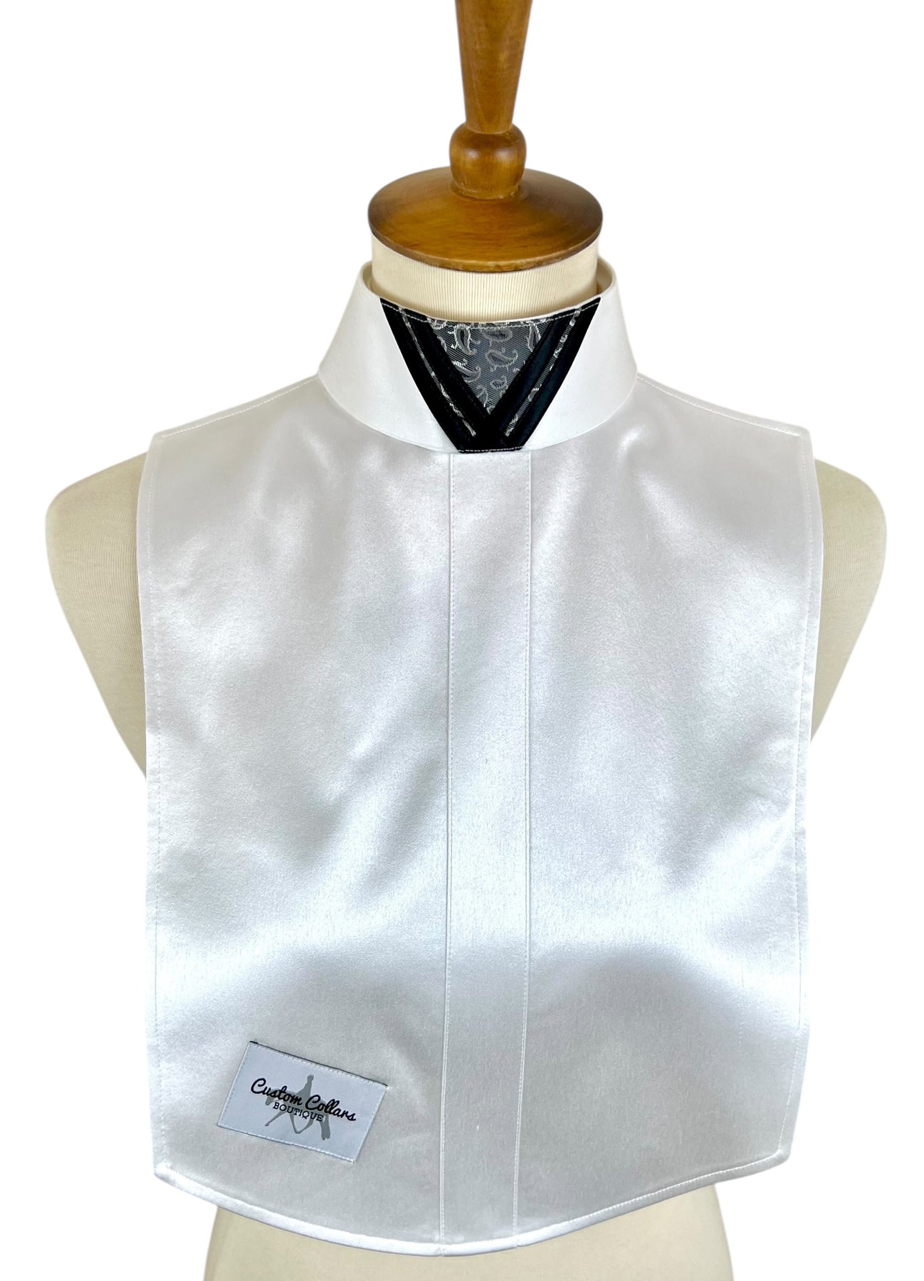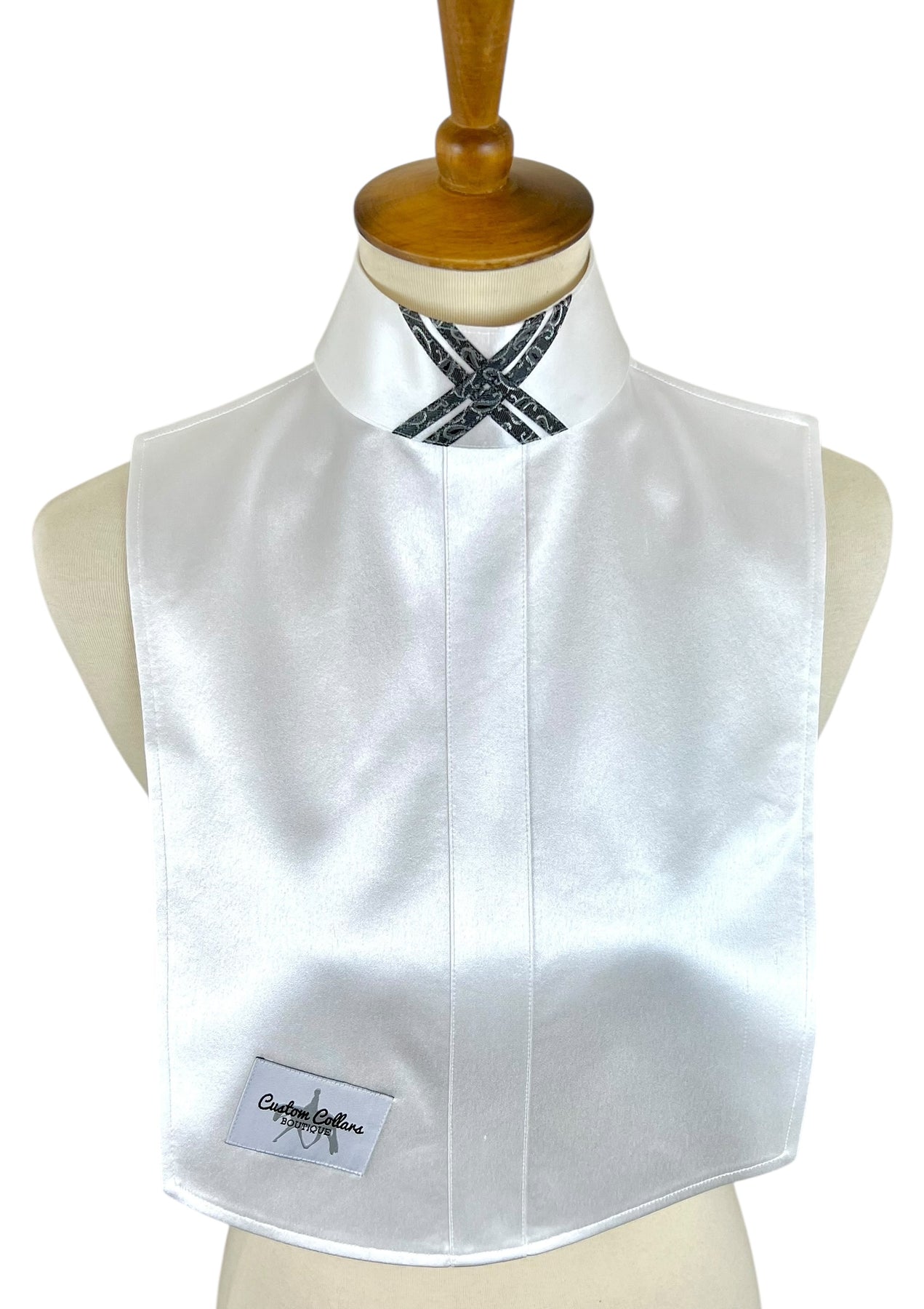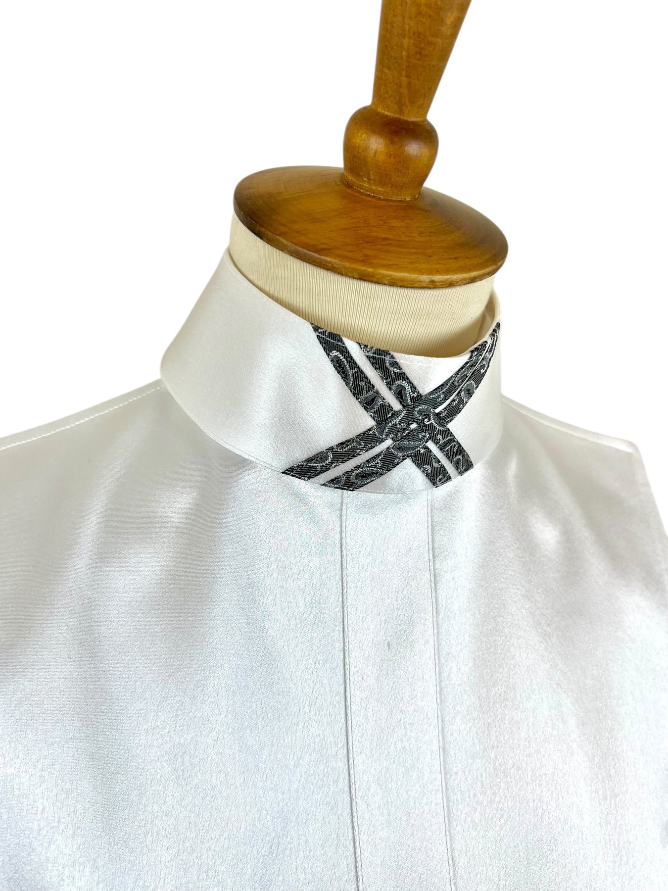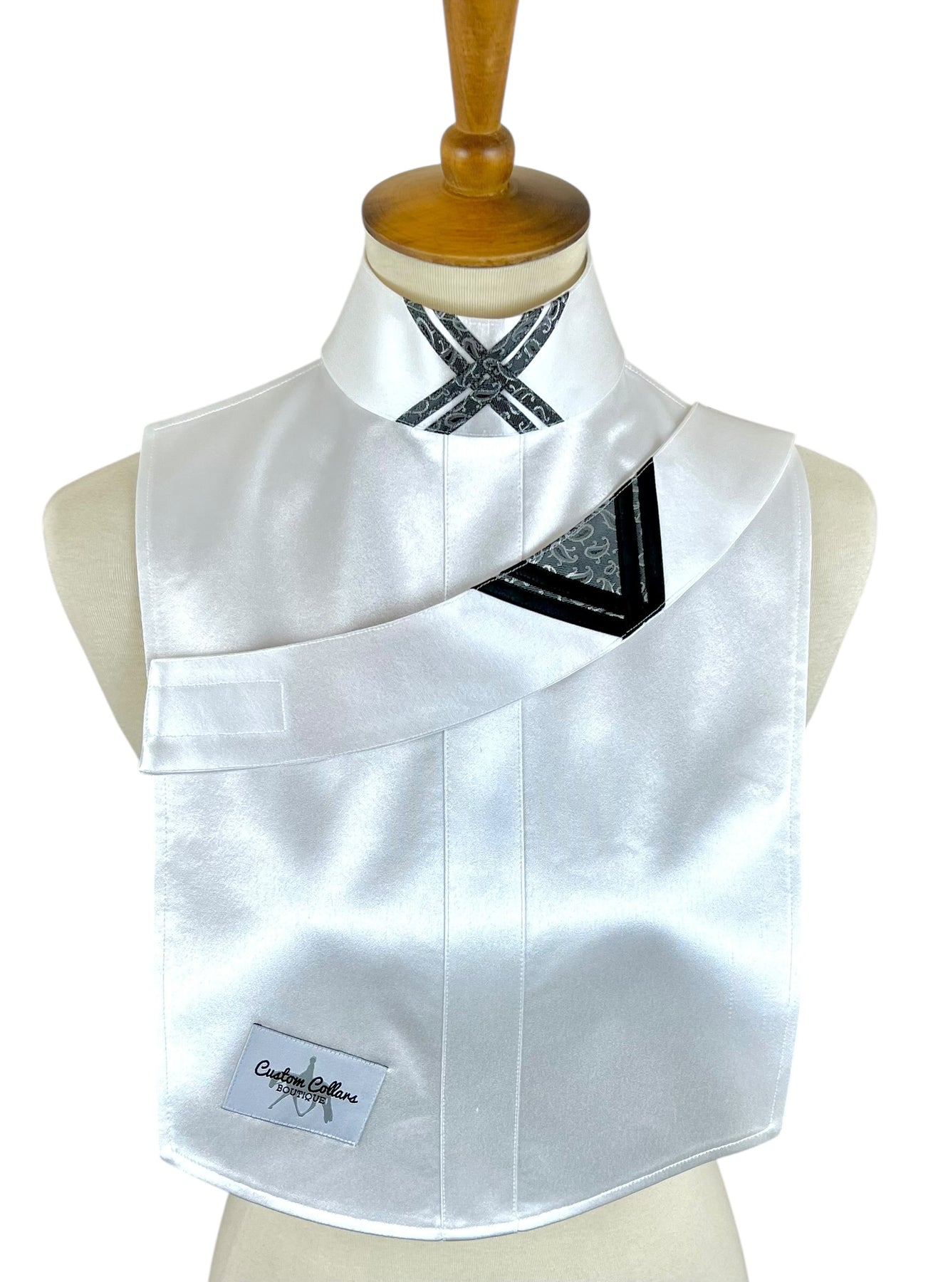 This gorgeous silk dickie features a white silk base and pairs with two silk collars with gray paisley & black accents.